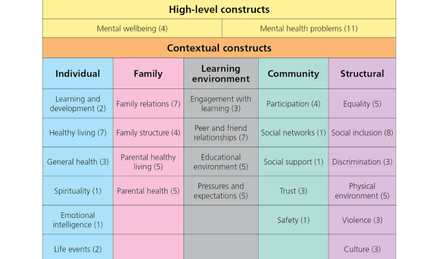 These indicators were finalised in late 2011 and set out a range of mental health outcomes – things that contribute to mental well-being and to mental health problems and arrange of contextual factors such as family, environment, community, learning environment etc.